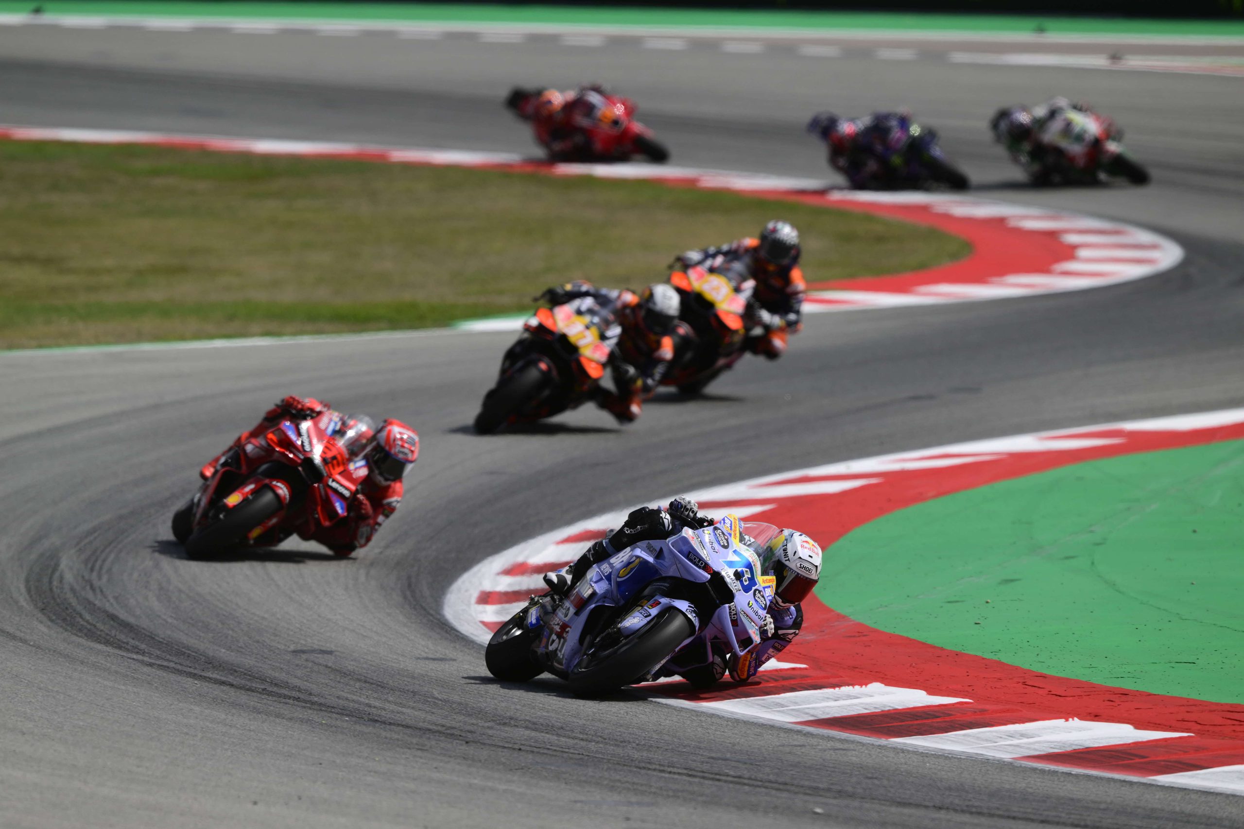 Lejos de dejarse «estar» por el error cometido, Alex Márquez volvió el domingo más fuerte. Sin embargo, era Marc quien frenaba mejor y tomaba el mando las primeras vueltas. El líder del campeonato imponía el ritmo, aunque era seguido de cerca por su hermano y por Acosta. Empezando la cuarta vuelta, Alex le ganaba el interior a Marc y aguantaba la arremetida de la Ducati oficial para ponerse primero. Conforme pasaban las vueltas, Acosta perdía rendimiento en el neumático y era rebasado por Bastianini. El italiano del Tech3 intentó ponerse en ritmo de punta, pero claudicó en el ecuador de la carrera; todo era una batalla por el apellido.