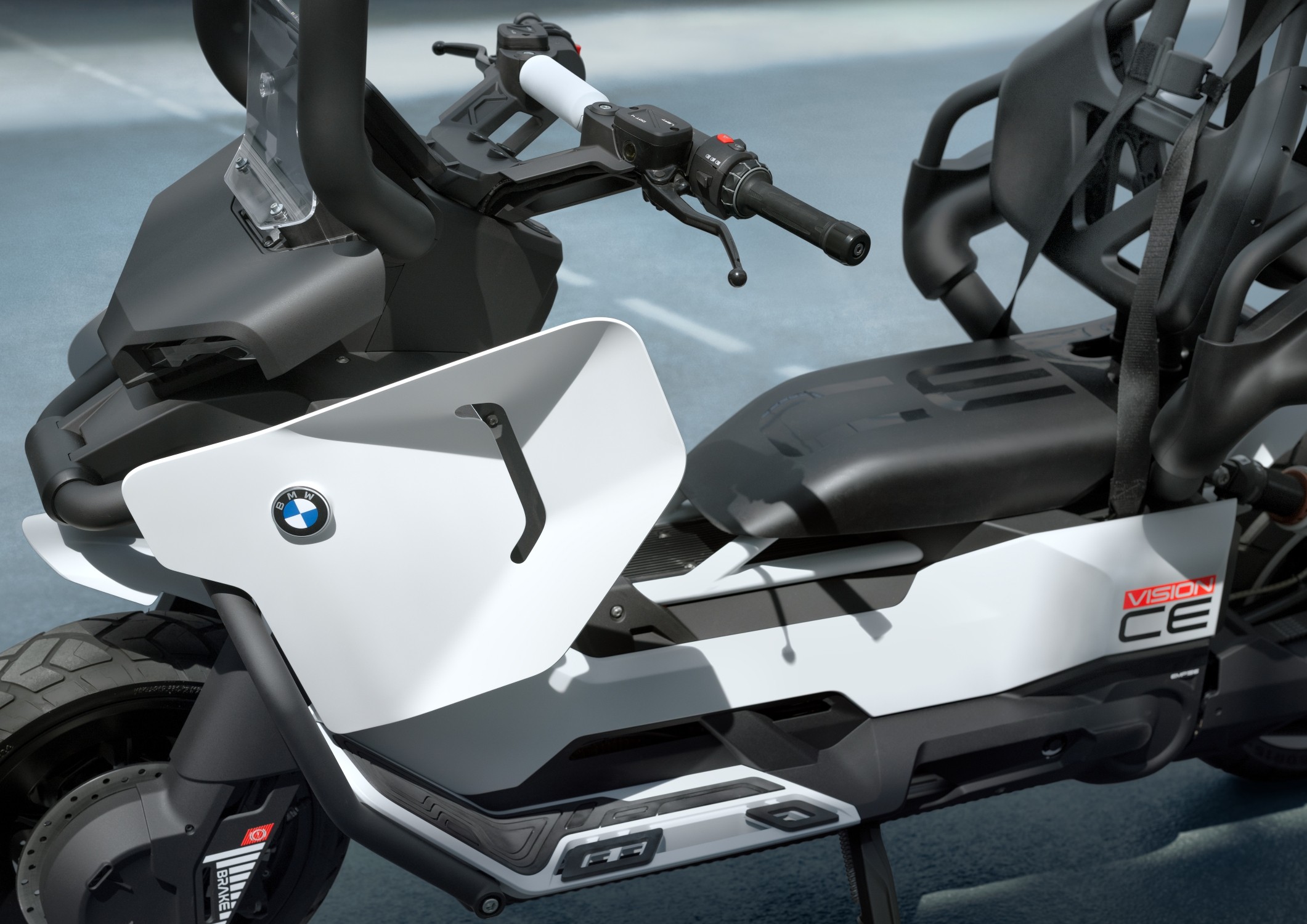 Lo innovador de este BMW Vision CE es la estructura tubular que se extiende en todo el cuerpo del modelo y que «envuelve» completamente al piloto. De esta forma, según la propia marca, se elimina la necesidad del casco. Esto hace una referencia obvia al primer CE, lanzado hace 25 años, pero que no tuvo un gran éxito comercial.