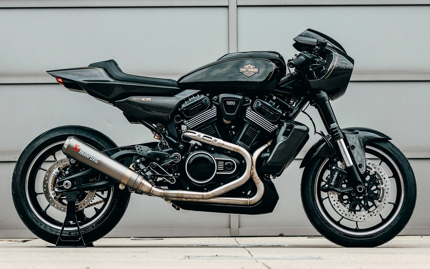 La RM es una abreviatura de Revolution Max, el nombre con el que se conoce al propulsor que la impulsa, mientras que el CR viene de Café Racer. La Harley-Davidson RMCR Concept esta impulsada por un V2 refrigerado por líquido de 1250 cc y más de 150 CV. Asimismo, en su diseño posee, aclarado por la propia marca, fuerte inspiración de la Harley-Davidson XLCR, motocicleta del mismo segmento lanzada en la década de los 70 y con influencia del mundo de las carreras.
