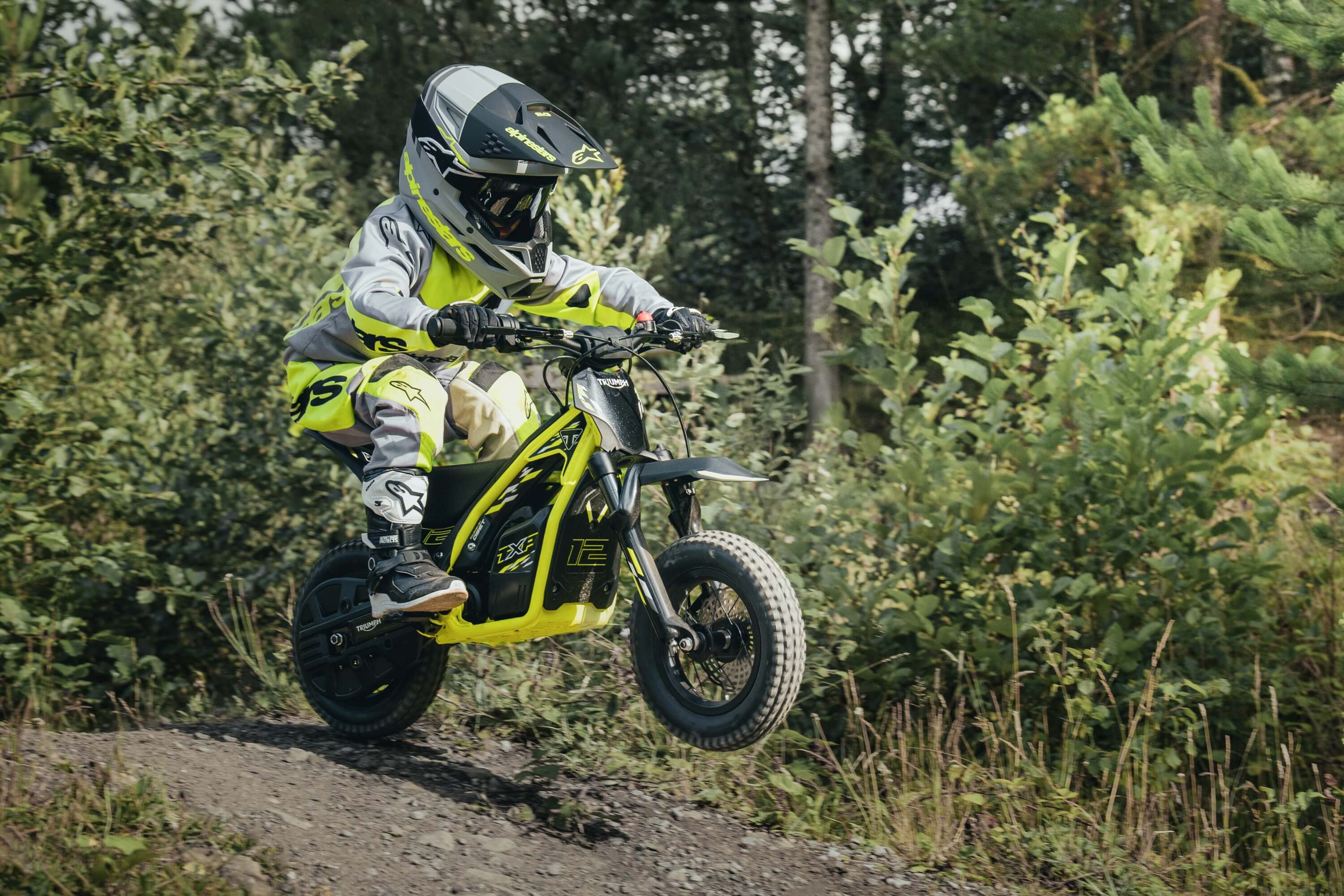Cada Triumph TXP está diseñada con un cuadro de acero ligero, cuyas geometrías están adaptadas a cada edad, con la posición del asiento ajustable y una ergonomía especialmente adecuada a los niños. Las suspensiones también están adaptadas al tamaño de cada piloto, con las horquillas y los amortiguadores ajustables para adaptarse al crecimiento y a la variedad de terrenos.