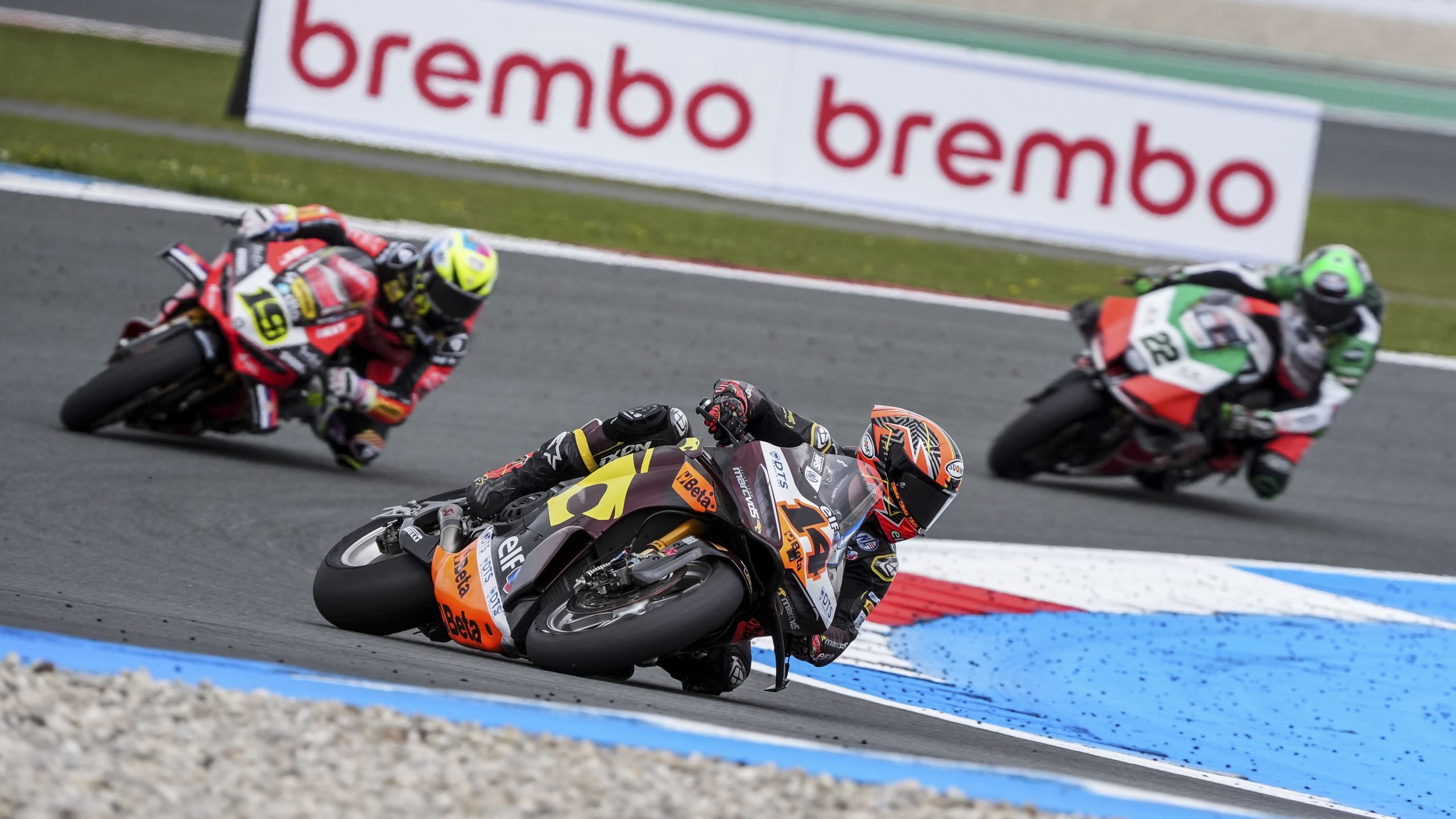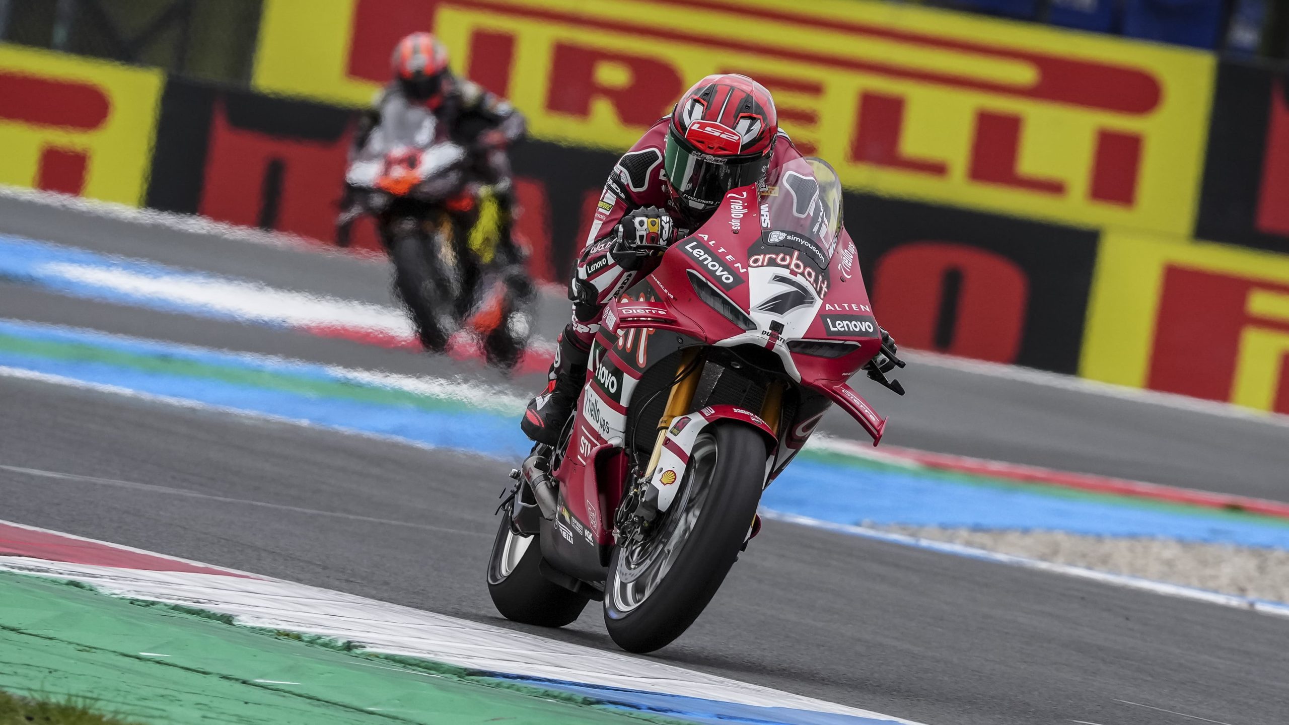 Con Sam Lowes sumándose a ellos, las últimas vueltas fueron dramáticas El ataque respuesta entre las Ducati oficiales era demencial, pero la lluvia se había detenido y Bulega tenía algo más de ritmo en seco; recuperaba la primera posición en la antepenúltima vuelta y se hizo con su séptima victoria de la temporada en siete carreras.